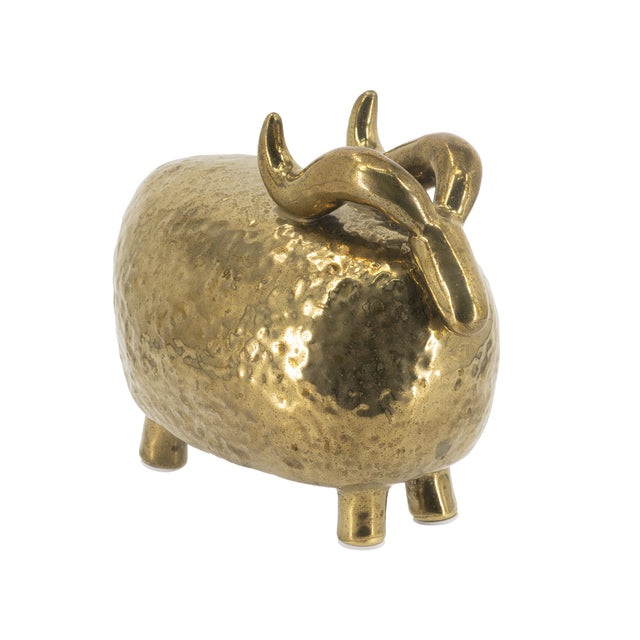 Añade un toque de elegancia y alegría a tu espacio con esta escultura de carnero de cerámica artesanal, que luce un cuerpo abstracto y regordete, cuernos curvados y un brillante acabado dorado martillado que le da una textura lujosa. Con 19 cm, es ideal para estanterías, escritorios o repisas, combinando el encanto rústico con la fantasía moderna. Perfecta como decoración o un regalo especial para los amantes del signo Aries, evocando fuerza y arte en un formato compacto.