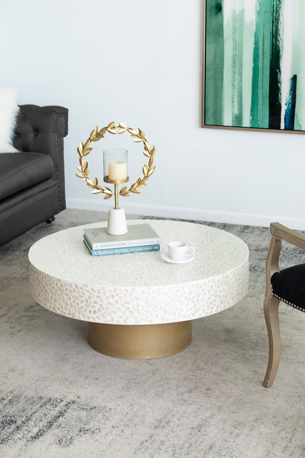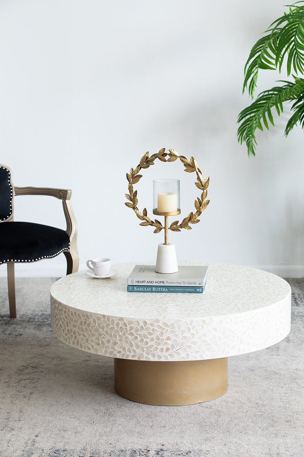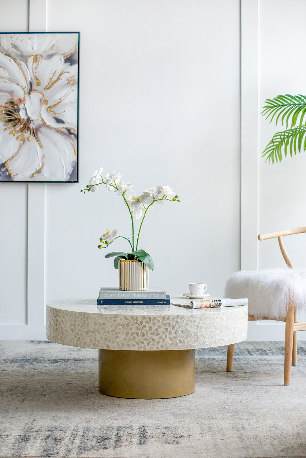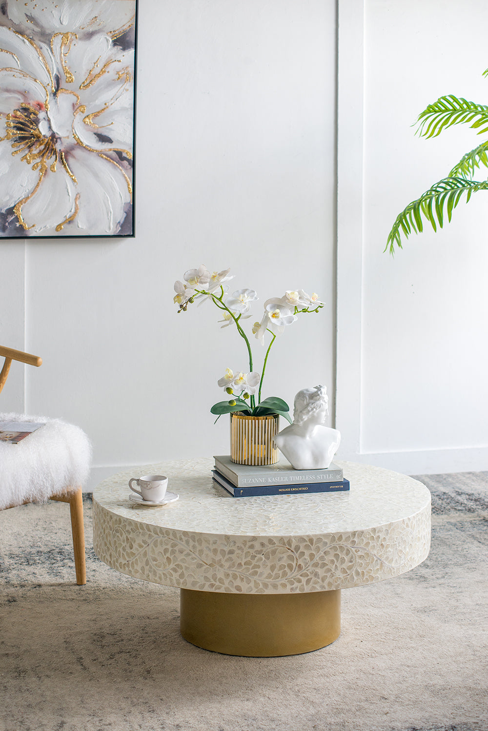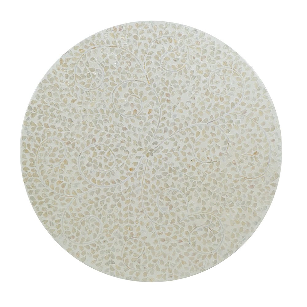 Elaborada en color crema, presenta un magnífico diseño de Capiz de enredadera, formado por piezas meticulosamente incrustadas y complementado con una base de pedestal. Perfecta para un retiro de lujo o una habitación bohemia contemporánea.