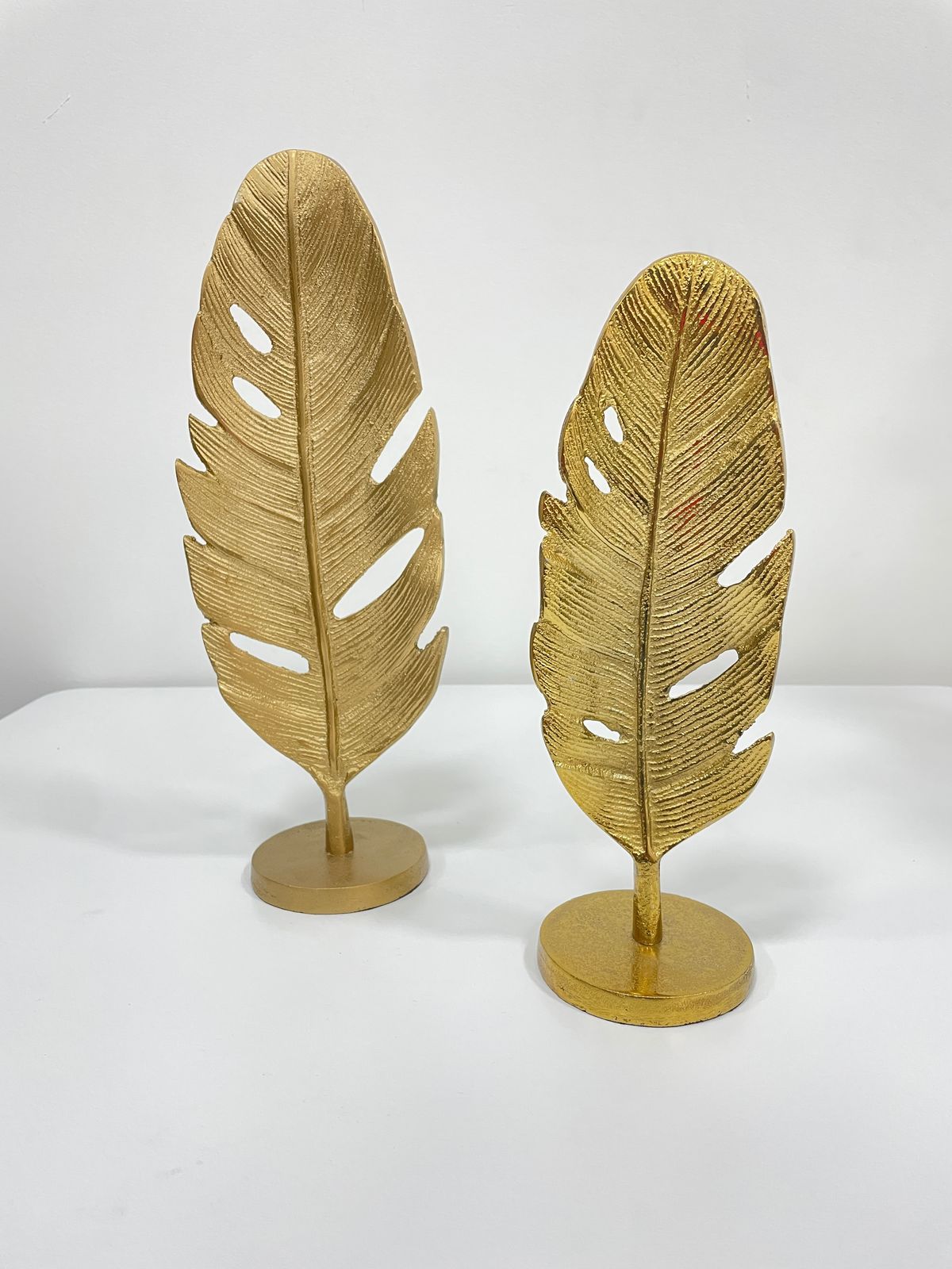 Pieza decorativa metálica en forma de hoja dorada, viene en tamaño grande 36cm y tamaño pequeño 28cm.