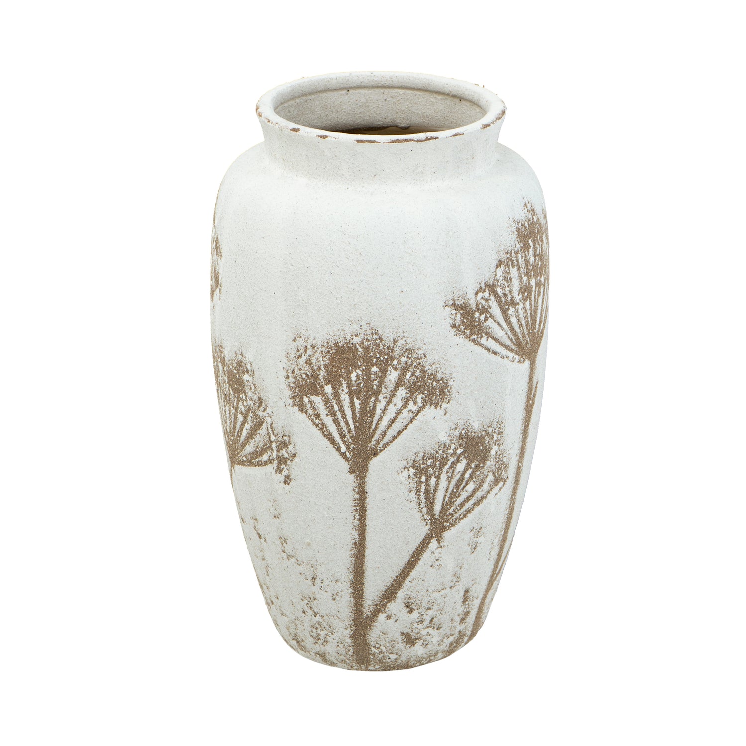 Combinando la intriga de la cerámica clásica europea con el encanto natural de la naturaleza, este jarrón presenta una silueta cilíndrica, un acabado blanco terroso y patrones abstractos de flores silvestres marrones. Ya sea solo o combinado con exuberantes flores, sin duda atraerá la atención desde cualquier mesa, repisa o cómoda.