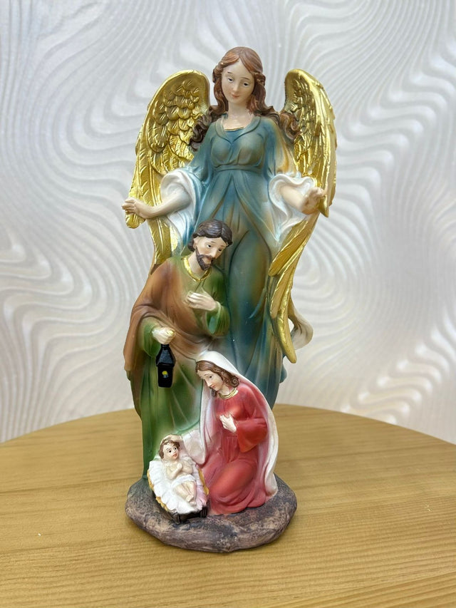 Esta pieza de decoración navideña de 25 cm representa la Sagrada Familia junto a un ángel, ideal para quienes buscan un detalle que combine tradición y elegancia en su espacio.